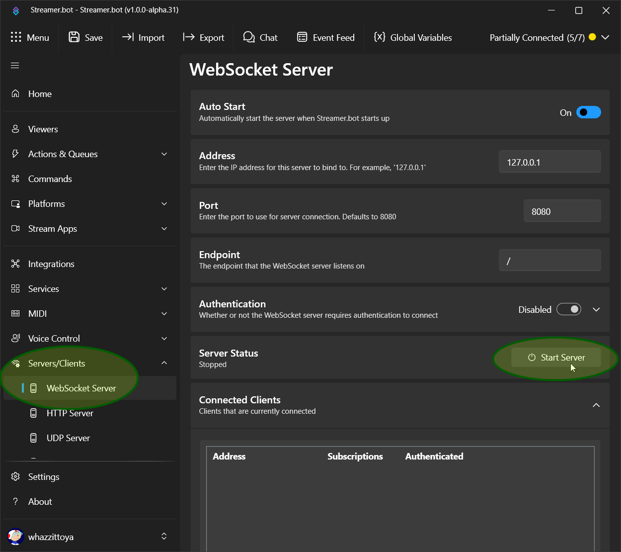 If the server is running, but it still won't connect, make sure all of the settings above match Streamer.bot's server settings: After updating any necessary settings, press the "Connect" button again.